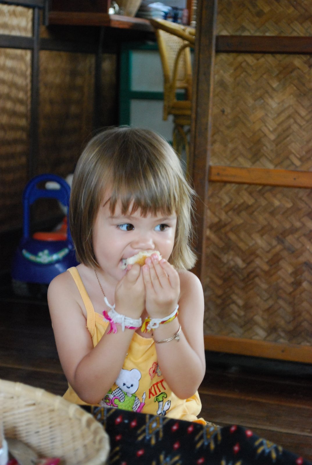 We stayed at Thongbay Guest house, right besides the Sisavangvong bridge. From the balcony of my room, I could see Phousi temple at the top of Phousi hill. The host was so friendly. She has one kid named Emily. She’s a lovable silent little girl. Her father is a Swiss national.