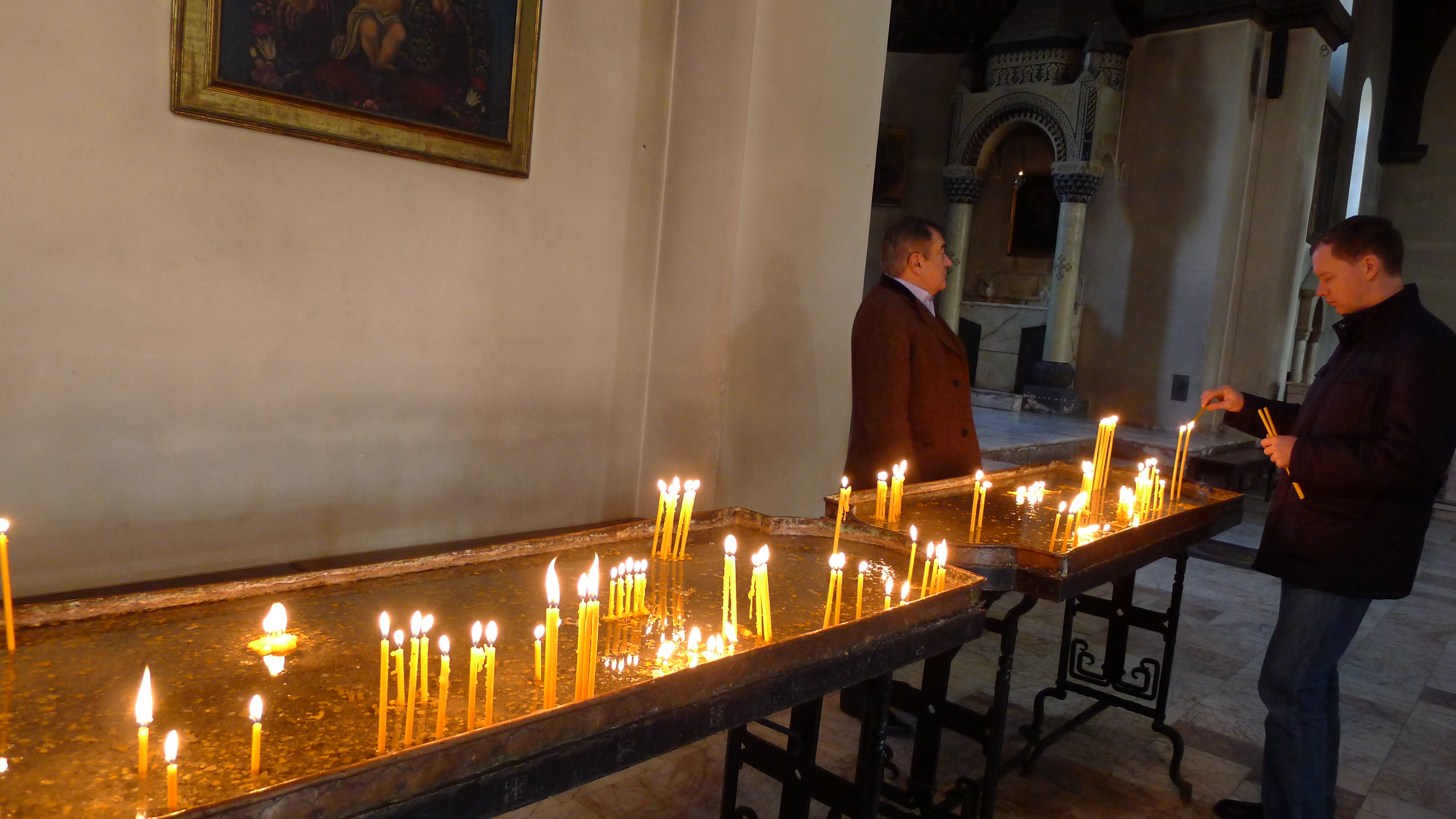 Peziarah Rusia menyalakan lilin sebelum berdoa di depan altar utama