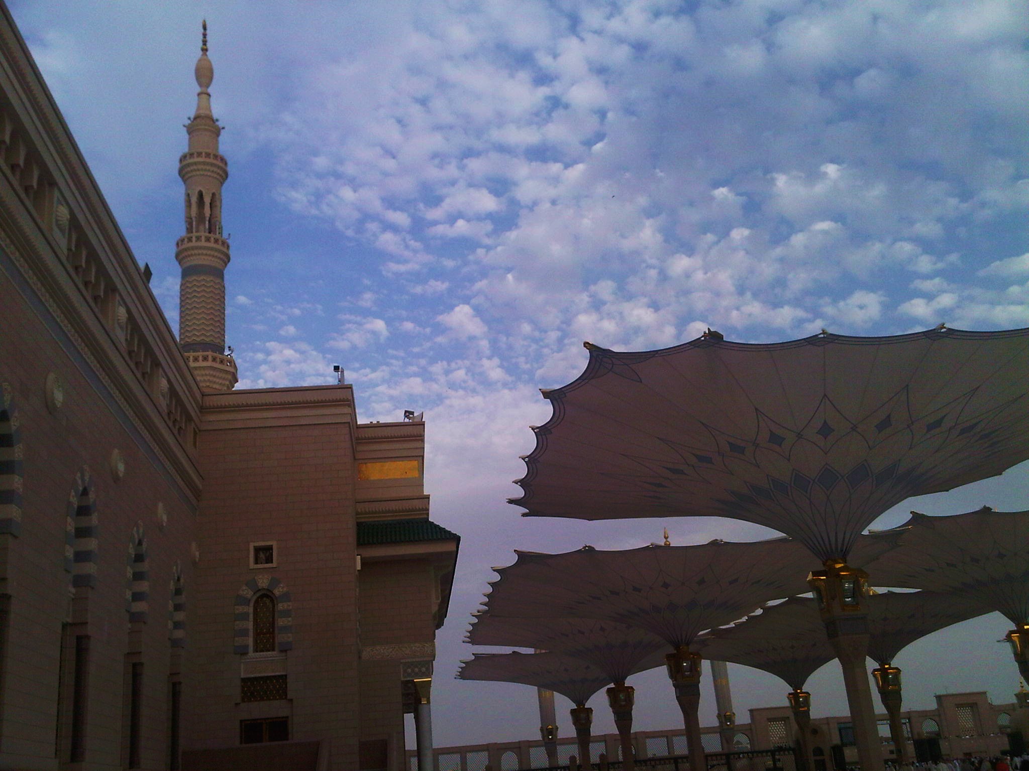 Menjelang akhir musim dingin waktu itu, kabut tipis dan suhu 4 derajat Celcius selalu hadir saat subuh hingga menjelang matahari terbit. Langit biru pucat, dengan awan berarak di atas langit Madinah. Payung-payung masjid Nabawi pun mulai dikembangkan, menaungi peziarah dari teriknya matahari Saudi menjelang siang nanti. Majestik, anggun dan ultra modern. Begitulah masjid terindah di seantero bumi ini terkesan. Kilauan emas di dekorasi tiang, lampu dan kaligrafi interiornya berpadu dengan kokohnya menara dan payung berteknologi terkini. Sebuah manifestasi bahwa Islam tidaklah anti dengan ilmu pengetahuan dari Barat dan perubahan yang dibawanya.